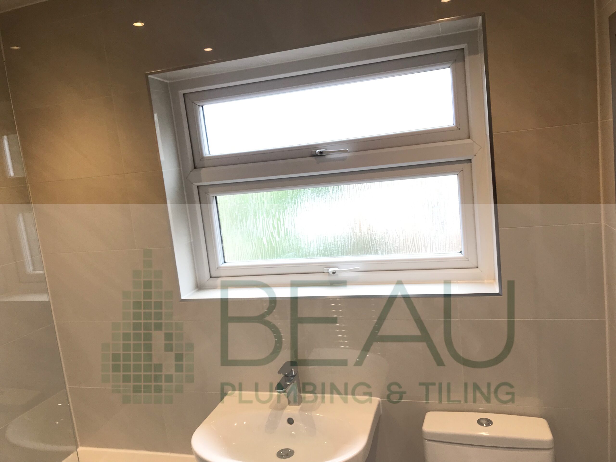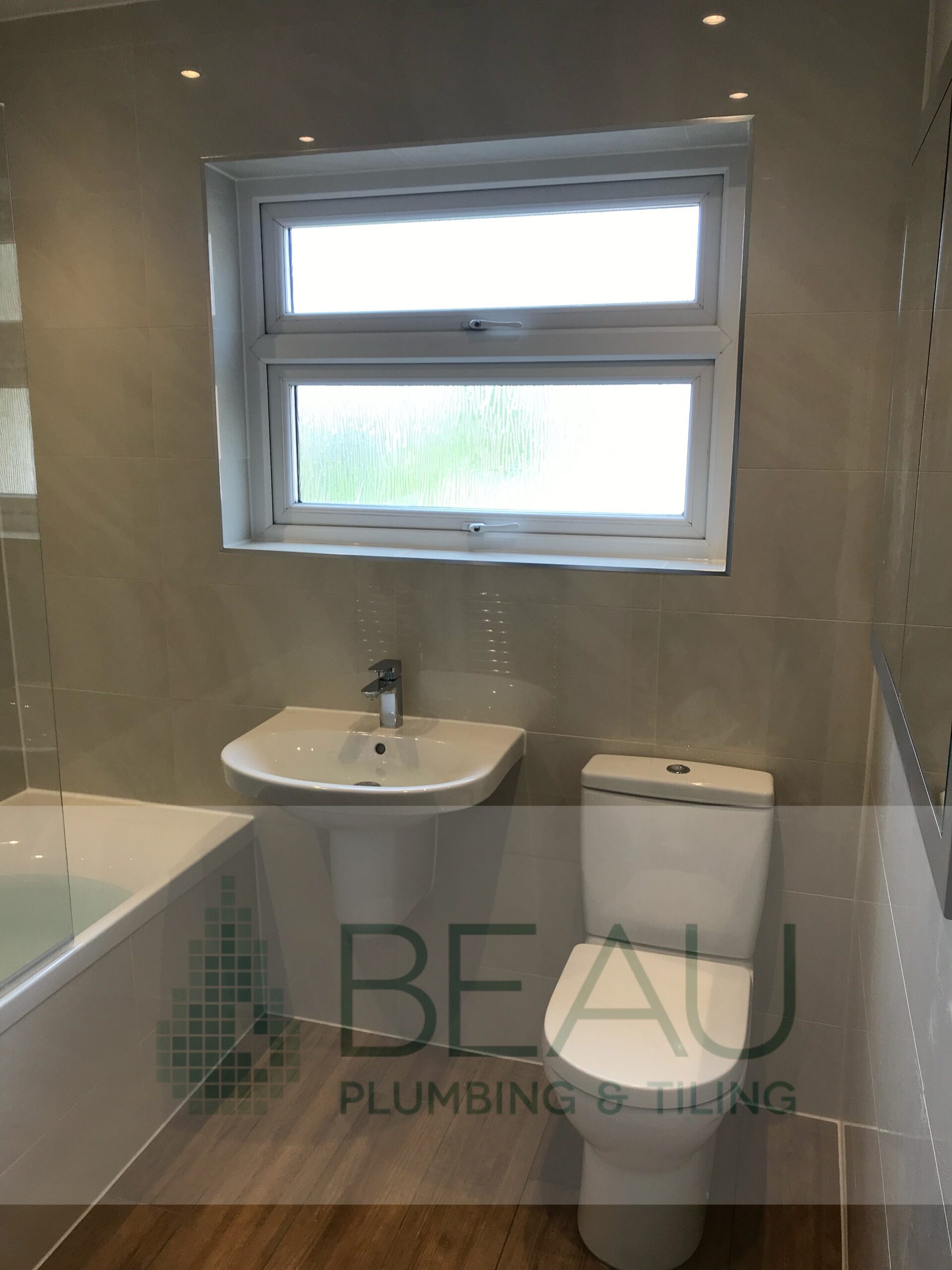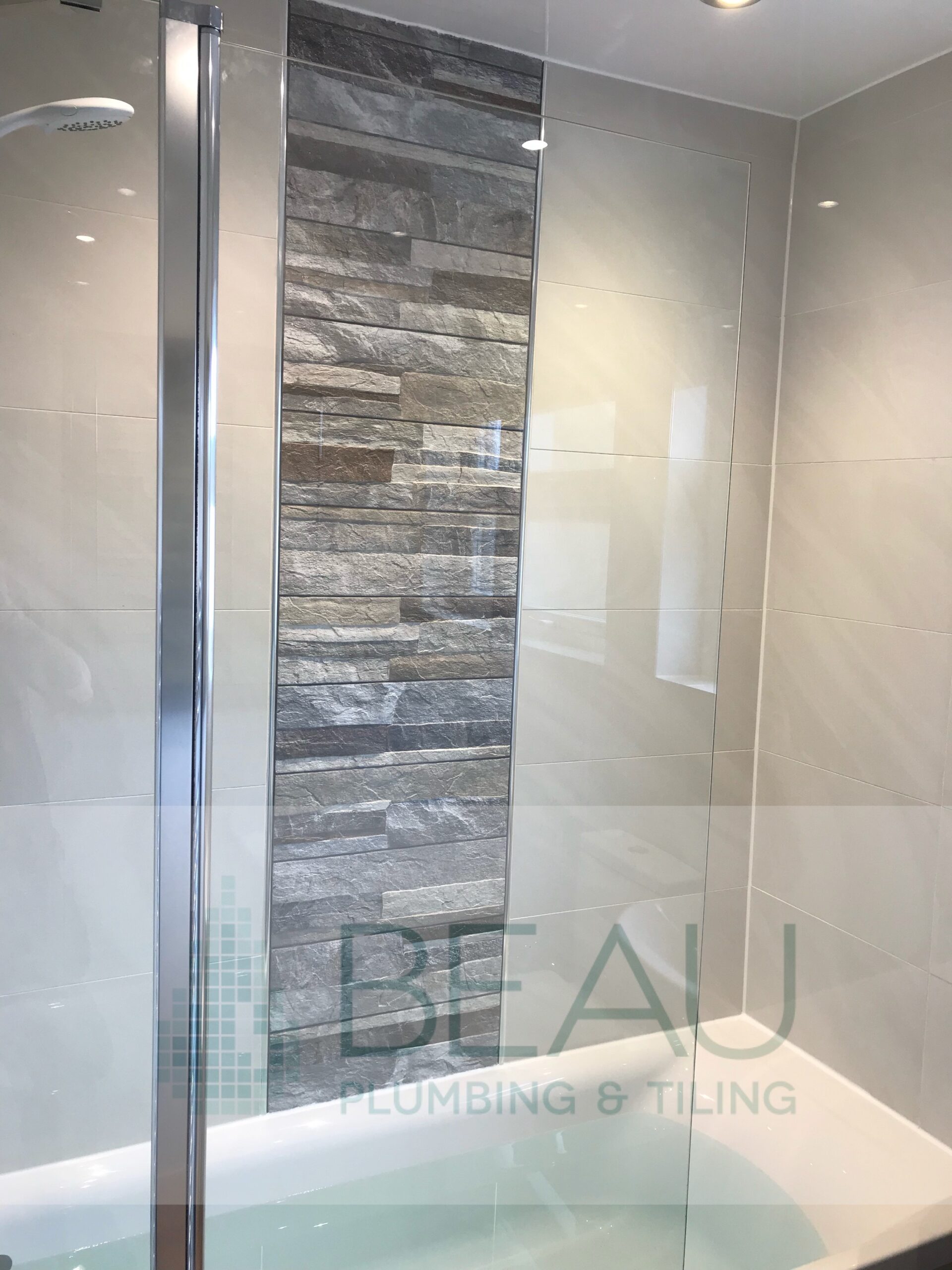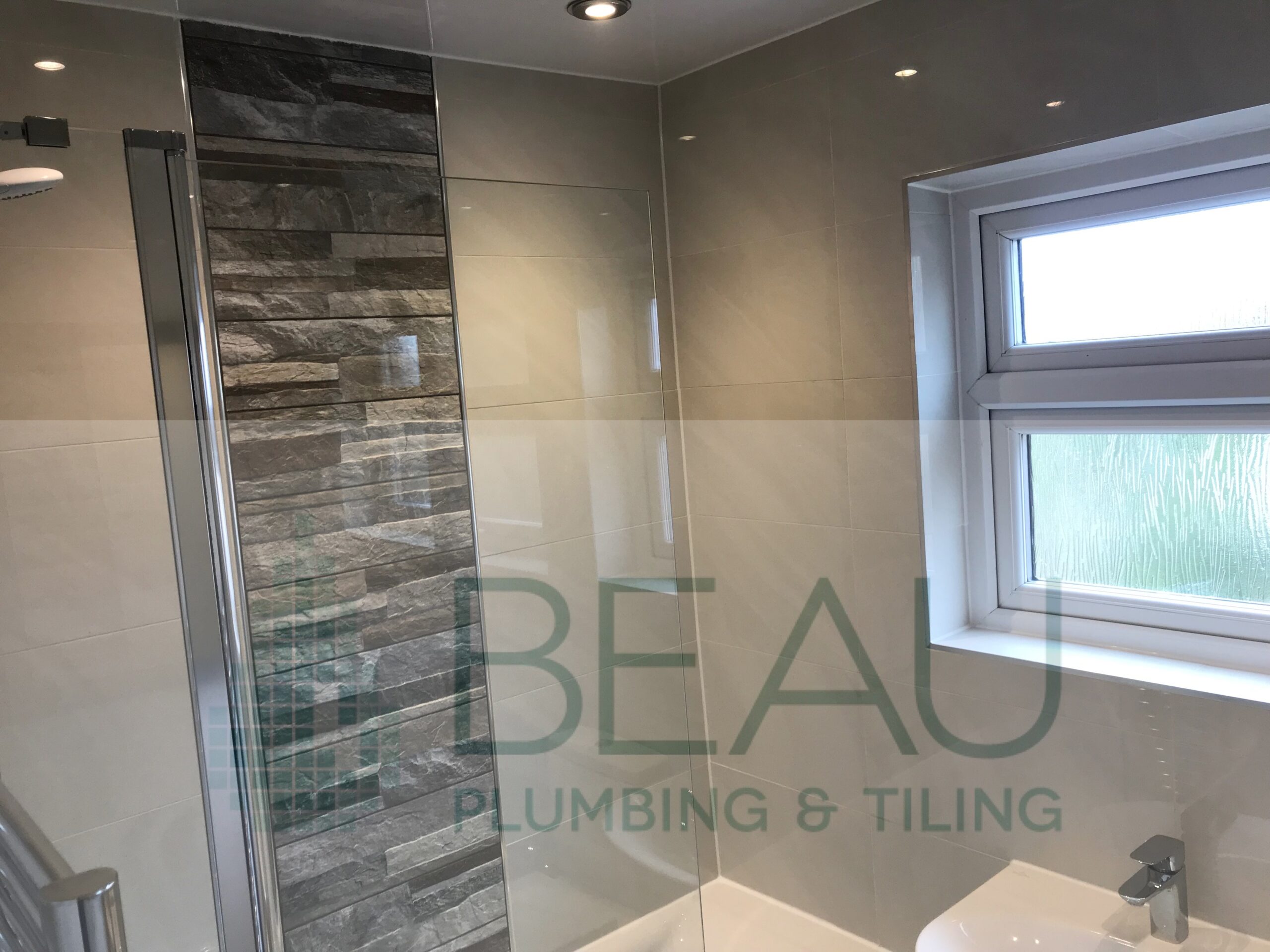 Within this bathroom we have 600×300 tiles alongside a centred feature on the bath wall which nicely breaks up the tiles. On the floor we have Wood Plank Tiles which have underfloor heating underneath to take the chill out of the tiles.